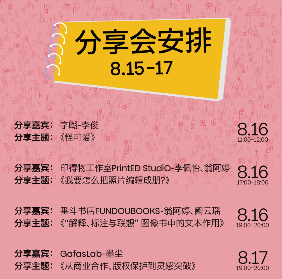 本次BIGGER艺术书展的分享会全程对外开放。无论是创作者的深度分享、行业前沿话题探讨,还是灵感碰撞的互动环节,都向所有感兴趣的朋友敞开大门,沉浸式感受创意与思想的交锋,轻松解锁这场知识与灵感的盛宴。