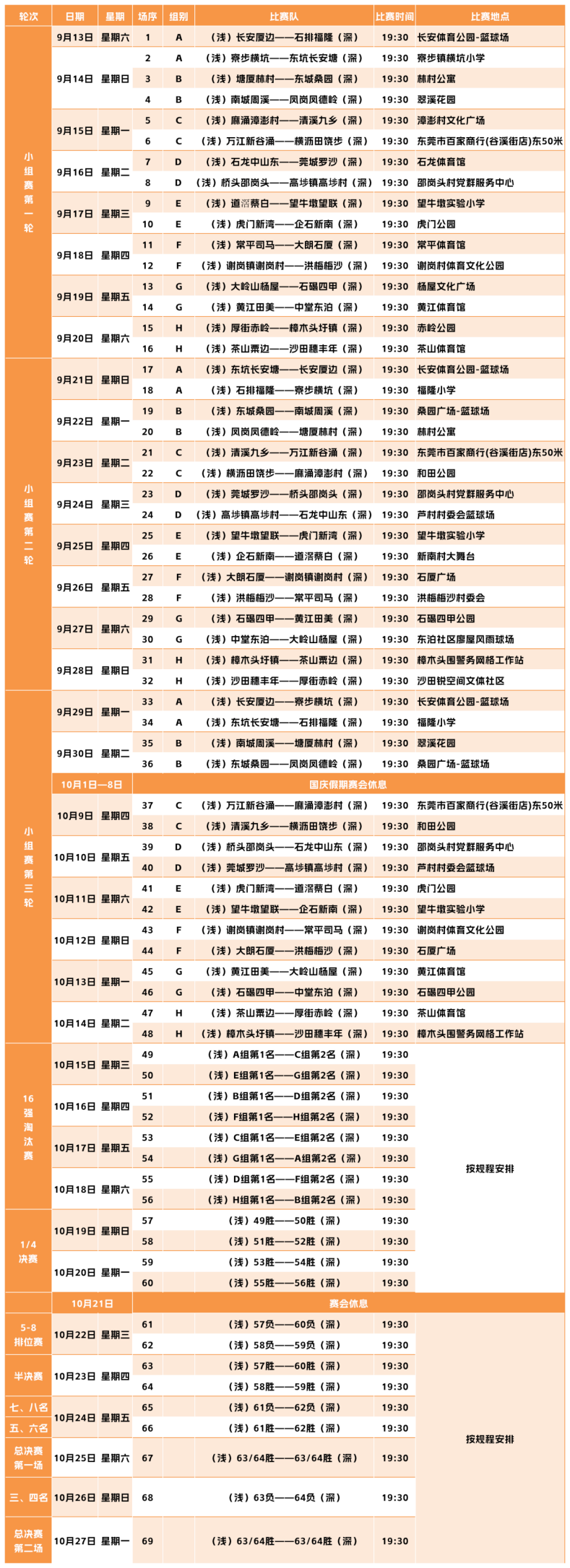 本次比赛将分两个阶段进行:第一阶段为小组单循环赛,8个组别共计32支球队将于9月13日至10月14日展开较量,每组前2名晋级十六强。第二阶段为单场淘汰赛,10月15日至24日期间,晋级八强球队将通过“一场定胜负”的激烈对抗进入前四名从而争夺总决赛名额。最终的巅峰对决将采用两回合主客场制,分别于10月25日、27日上演,确保赛事悬念与观赏性。