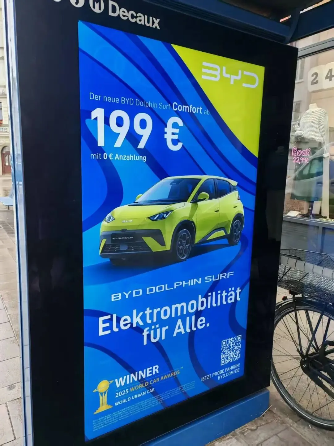 与此同时,在慕尼黑街头的公交站广告屏上,比亚迪海豚的零首付贷款买车广告和欧洲汽车品牌的新车广滚动播放,显示着中欧汽车业在市场上的较量。