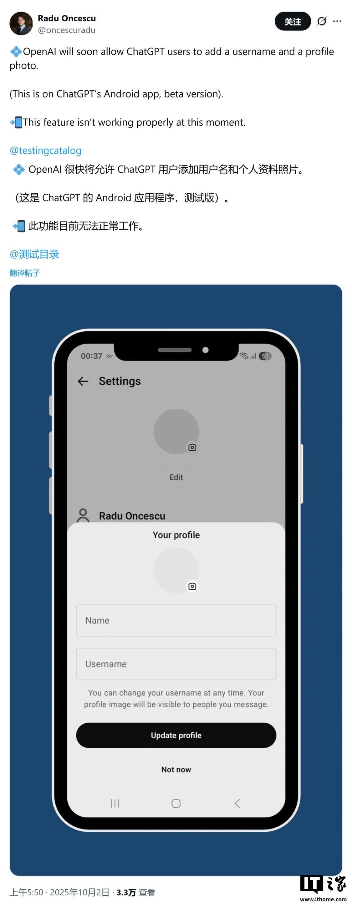 为了支撑该功能,OpenAI 正在同步开发一套完善的配套系统,包括支持用户自定义的“用户名”以及可上传头像的个人资料页面。这意味着用户未来将拥有专属的身份标识,并能够像使用其他社交应用一样,搜索并联系平台上的其他用户。