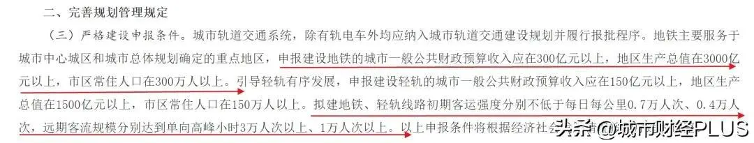 也即,申报地铁的城市,需要同时符合GDP在3000亿以上,财政收入在300亿以上,市区常住人口在300万以上,初期客运强度不低于0.7万人次,远期客流规模单向高峰小时3万人次以上。