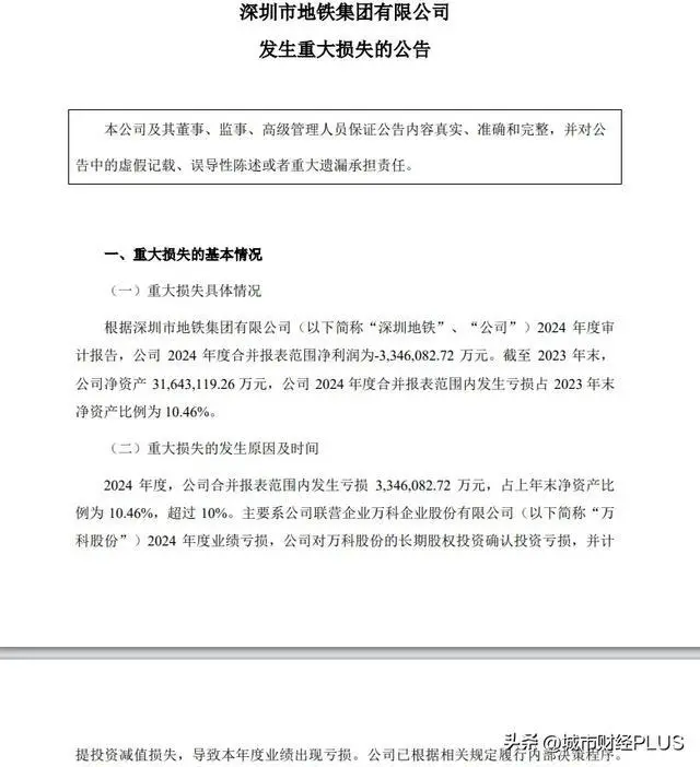 截至2024年末,深铁集团合并报表范围内发生亏损334.6亿元,占上年末净资产比例为10.46%,超过10%。