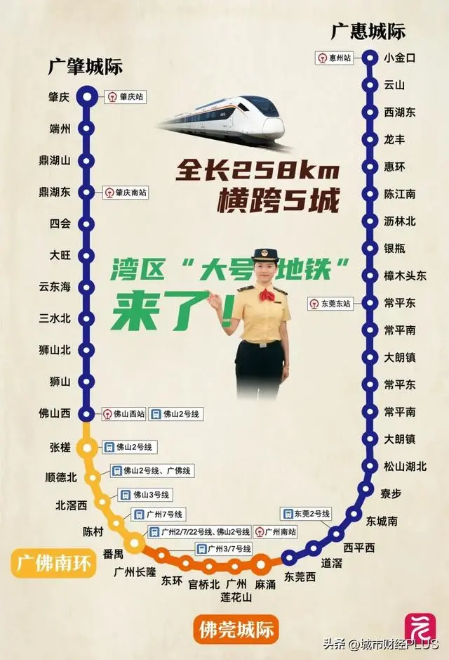 肇庆、惠州:去年开通的广佛南环城际(佛山西站—番禺站)、佛莞城际(番禺站—东莞西站),与佛肇城际(佛山西站-肇庆站)、莞惠城际(东莞西站-小金口站)对接相连,形成一条全长258公里,呈东西走向的超级“地铁”(地铁化运营)。