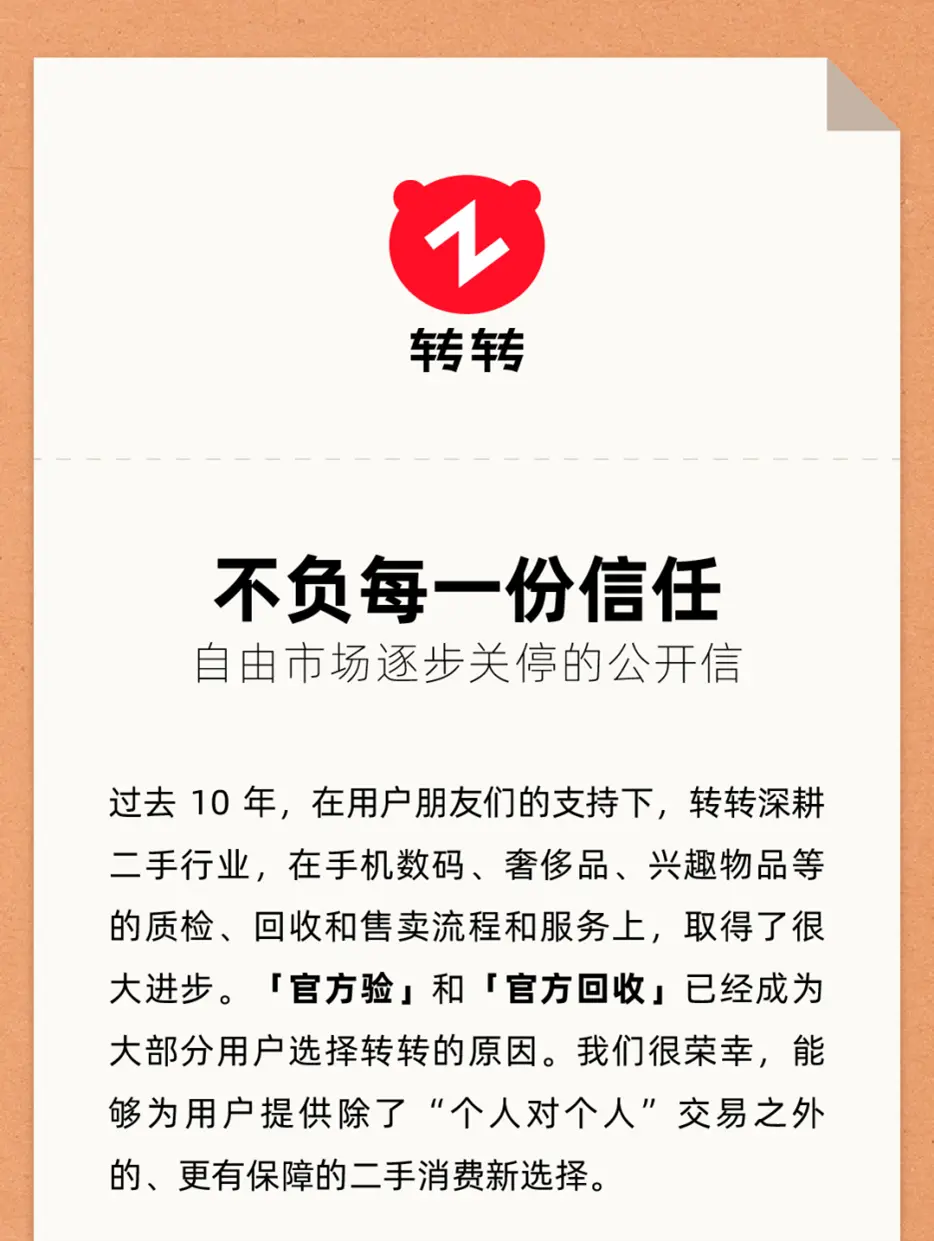 近日,转转官宣逐步关停自由市场业务,聚焦C2B2C模式。平台将从个人撮合的角色,转为承担商品回收、质检、再售与售后等一整套流程的运营方。