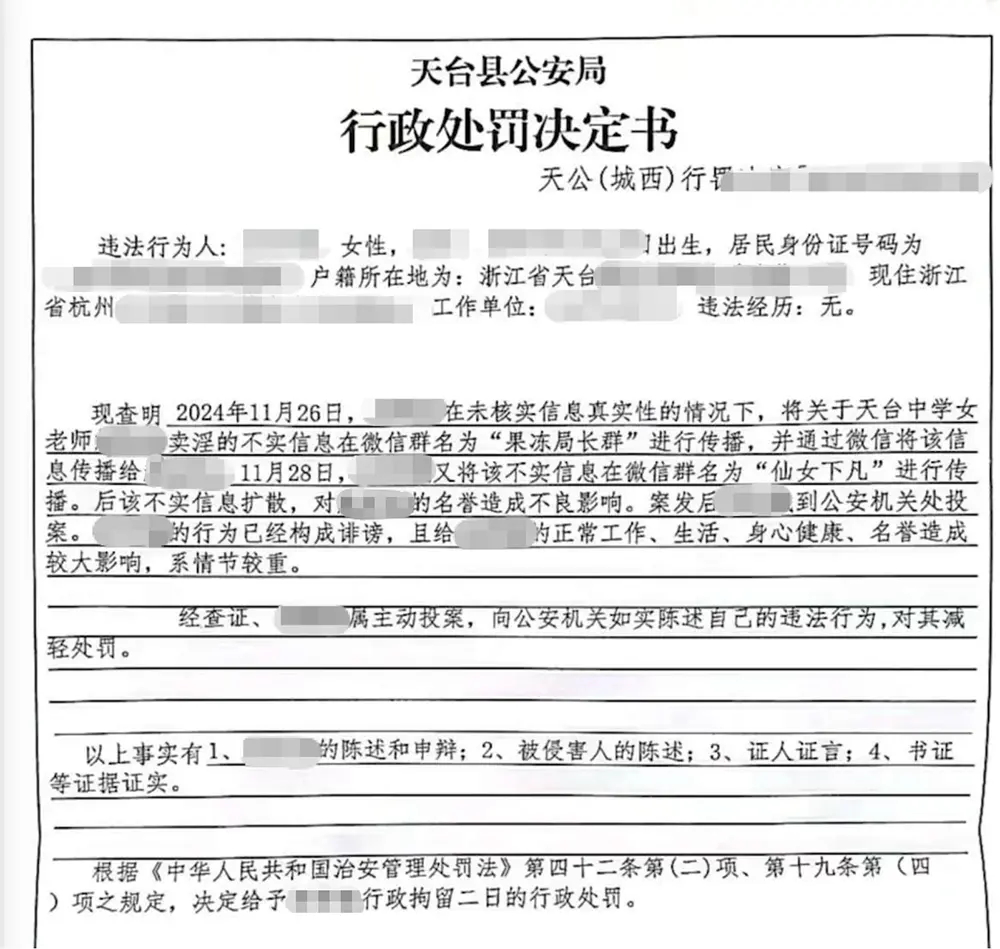 近日,浙江省台州市天台县公安局的一则处罚决定书,引发媒体热议和公众关注。事情起因是杭州一名女教师在三人的微信聊天群中八卦他人,被警方以诽谤为由作出了行政拘留二日的处罚。