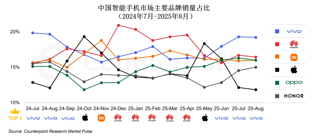 更令人震撼的是市场格局的剧变。储殷坦言:“我知道华、小、v三家做的比较大,但没有想到做得这么好。”根据Counterpoint Research发布的2025年第三季度中国市场智能手机销量数据显示,华为、vivo和小米已稳居市场前三,份额合计超过50%。具体来看,华为与vivo均占据17.6%的市场份额,小米也达到16.4%。这意味着,中国每卖出两部手机,就有一部出自“华小v”之手。