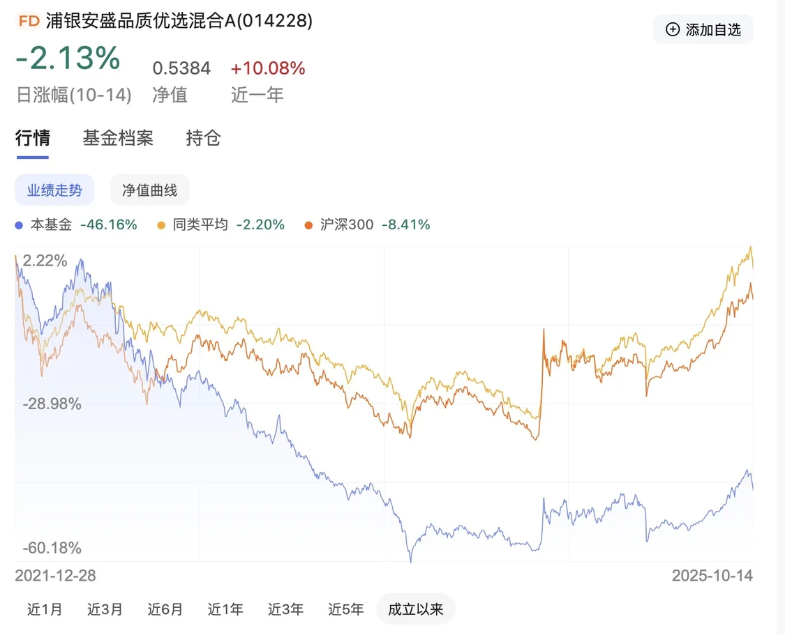 截至发稿前,蒋佳良管理的浦银安盛品质优选混合A自成立以来收益率达-46.16%,净值从初始值跌至0.538元。该基金成立时规模为26.25亿元,至2025年6月末仅剩6.95亿元,规模缩水超70%。