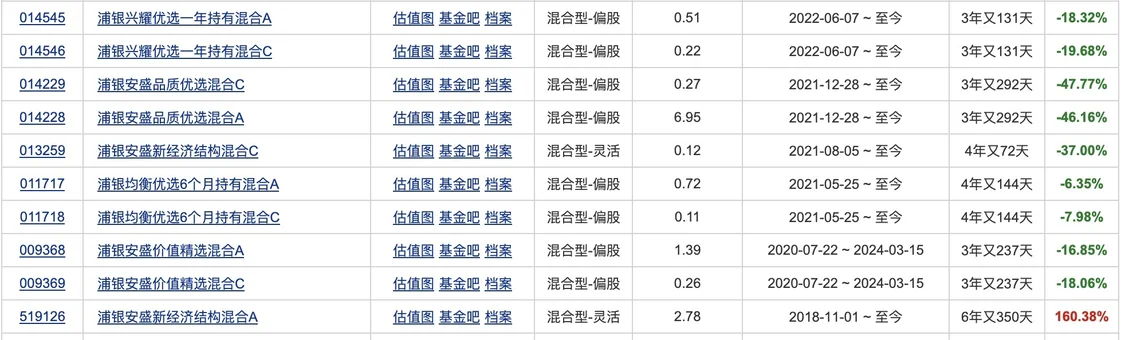 不仅这一只产品表现糟糕,蒋佳良管理的其他产品同样不尽人意。浦银兴耀优选一年持有混合A成立以来收益为-18.31%,浦银安盛价值成长混合A任职回报为-20.15%。唯一实现正收益的浦银安盛新经济结构混合A,其C份额却亏损约50.74%,显示其业绩表现极度不均衡。