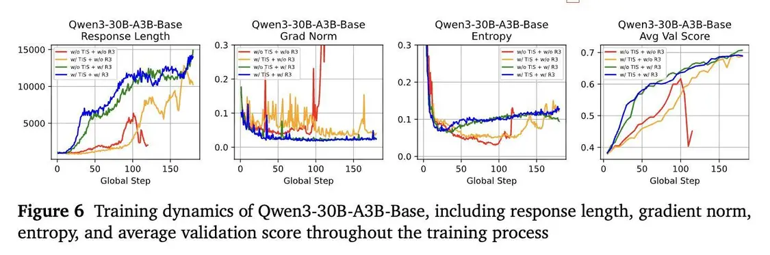 这篇论文提出了提升MoE模型强化学习训练的新方法Rollout Routing Replay(R3)。实验结果证明,R3的整体性能优于GRPO、TIS这类强化学习领域提升模型性能的优化算法,且引入R3的所有组合方法全过程无崩盘,训练过程中训练-推理KL散度等始终较低,在不影响训练速度的情况下,使得极端token比例减少一个量级。