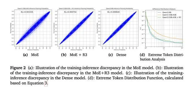 a、MoE模型中训练-推理差异的说明,b、MoE+R3模型中训练-推理差异的说明,c、稠密模型中训练-推理差异的说明,d、极端token分布函数