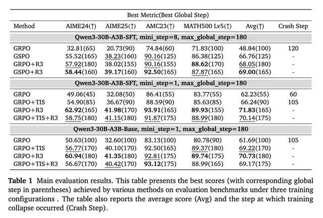 训练稳定性方面:如GRPO、GRPO+TIS等无R3的方法在单步更新场景中均出现崩盘,GRPO在60步崩盘、GRPO+TIS在105步崩盘。