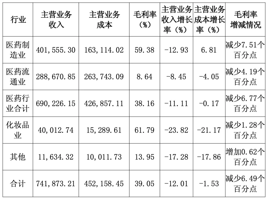 与此同时,医药流通业营收28.87亿元,同比下降8.45%;化妆品业营收4亿元,同比下降23.82%。三大主业全线遇冷,主要系医药制造业销售减少、毛利率下降所致。