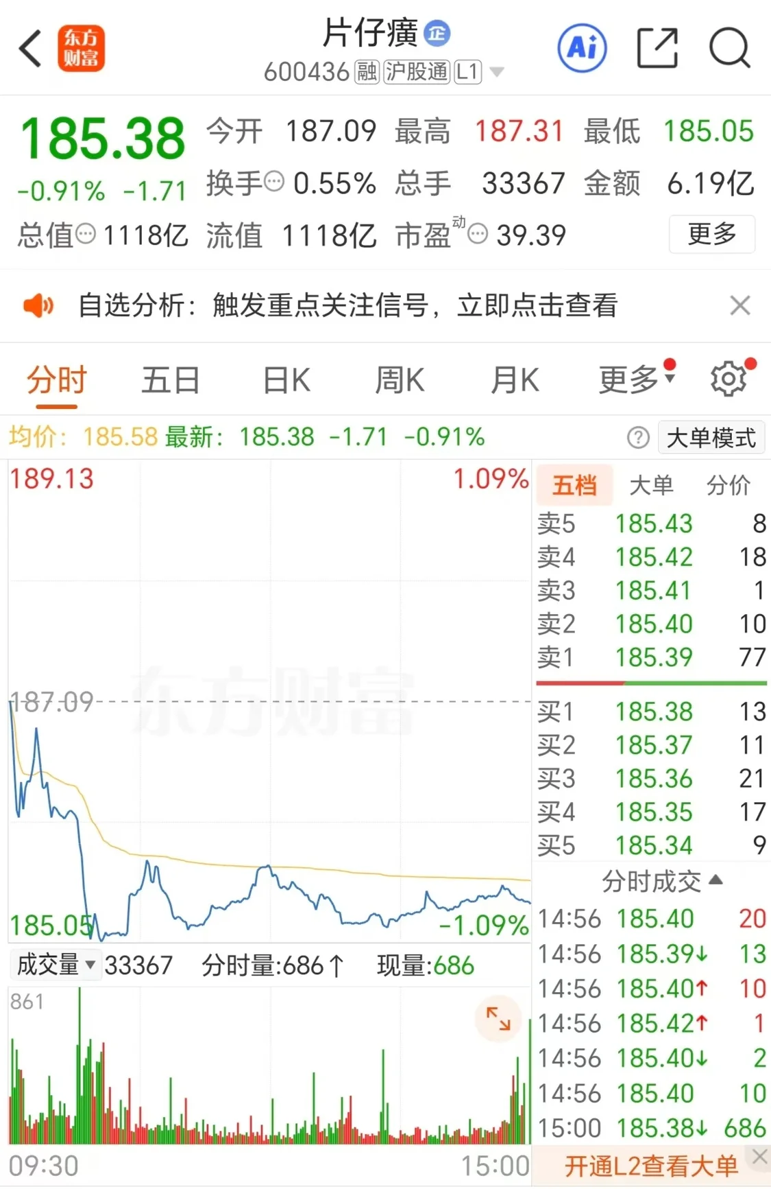 受此影响,市场信心遭受重创。2025年10月20日,即三季报披露后的首个交易日,片仔癀股价低开5.78%,收盘下跌4.71%,报187.09元/股。