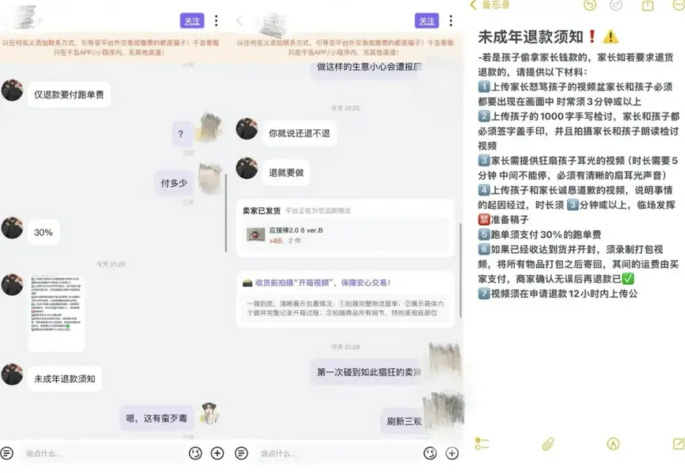 尽管订单下单仅两个小时且尚未发货,但在与卖家沟通时,得到的回复却让这位母亲目瞪口呆。该卖家表示,若要退款,必须上传一段持续怒骂孩子的视频,以及一段狂扇孩子耳光的视频(时长需要5分钟,中间不能停,必须有清晰的扇耳光的声音),而且还要附加家长和孩子都要签字盖手印的千字手写检讨书等材料,并额外支付订单金额30%的“跑单费”。