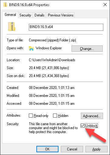 下载完压缩文件后,您需要解除阻止。否则,Windows 将不允许运行该可执行文件,这会导致在安装和运行 BIND 时出现各种意外错误。找到下载的文件,右键单击并选择“属性”,然后勾选“解除阻止”复选框(如下图所示),最后单击“确定”。