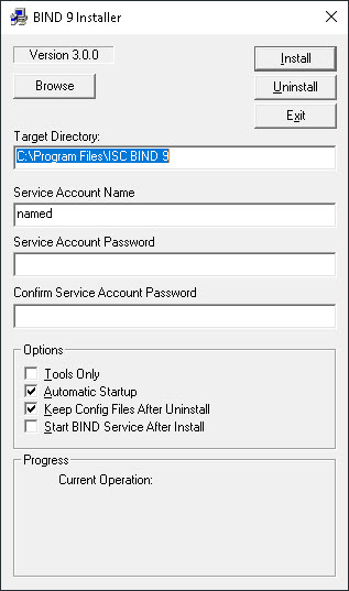 将目标目录设置为您希望安装 BIND 的位置。没有“浏览…”按钮,如果您对建议的默认目录不满意,则需要覆盖它。该文件夹无需预先存在,安装程序会在必要时创建它。