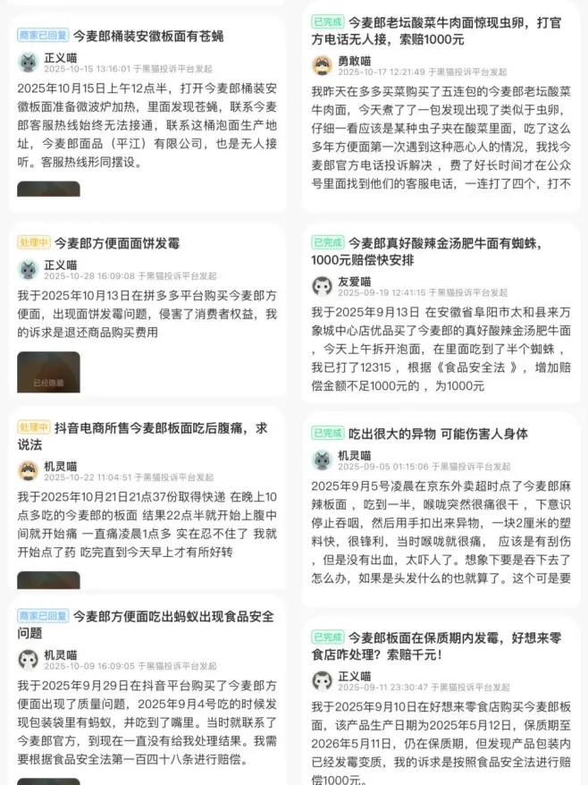 在小红书、抖音上,均有消费者投诉今麦郎产品中出现虫卵,在投诉平台上,关于今麦郎的投诉词条近1600条,大量与食品安全有关。
