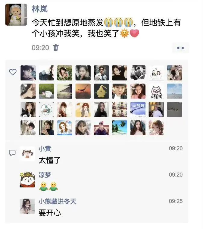 第二天醒来,她看到同事林岚也发了一条朋友圈:“今天忙到想原地蒸发[流泪][流泪][流泪],但地铁上有个小孩冲我笑,我也笑了🌞[爱心]”。短短两小时,几十个点赞、满屏留言:“太懂了”“抱抱”“要开心”。