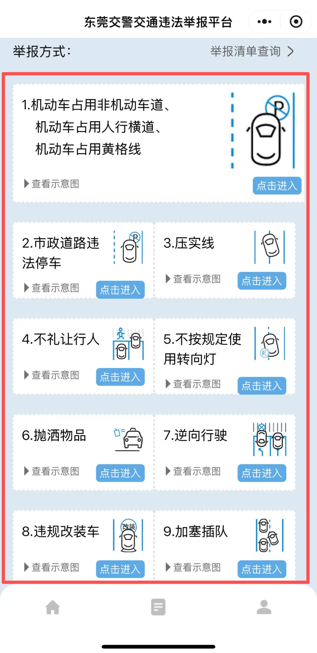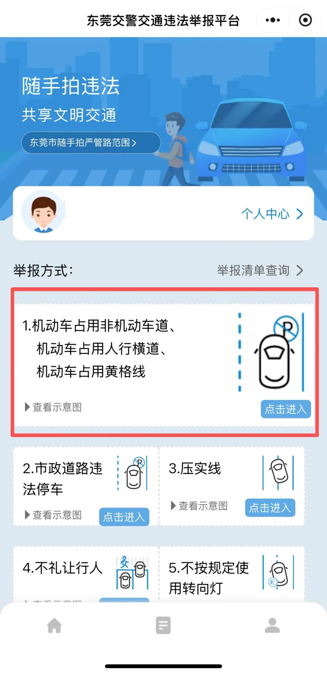 “东莞随手拍举报”小程序在原来的12类交通违法行为基础上,新增了“机动车占用非机动车道”“机动车占用人行横道”“机动车占用黄格线”。