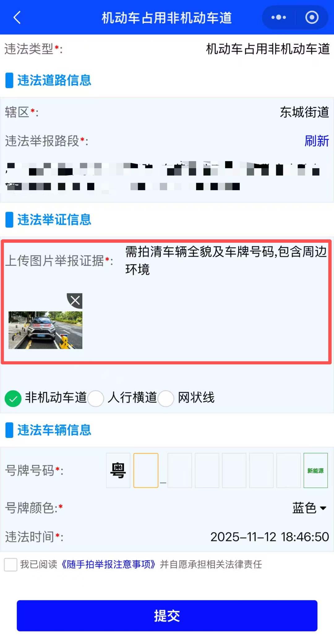 4、进入举报详情页面,参照指引上传图片或视频,选择违法类型、路段、填写车辆号牌等信息,并选择已详细阅读《随手拍举报注意事项》,最后提交即可完成举报。