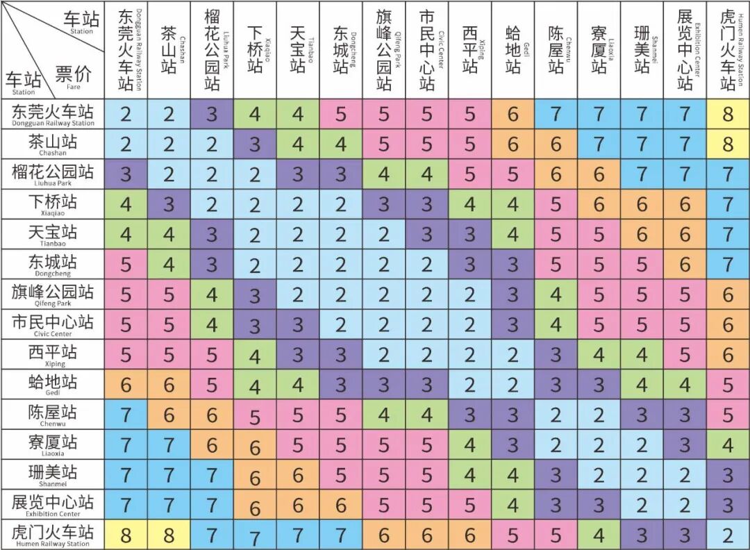 东莞轨道交通实行里程分段计价票制。起步价2元,可乘坐4公里;超过4公里的,4至12公里范围内,每递增4公里增加1元;12至24公里范围内的,每递增6公里增加1元;超过24公里的,每递增8公里增加1元。