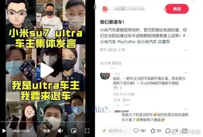 然而繁荣之下潜伏着危机,小米SU7 Ultra的碳纤维双风道前舱盖被车主质疑宣传和实际不符,车主们要求退车或者全额退还两万元定金。