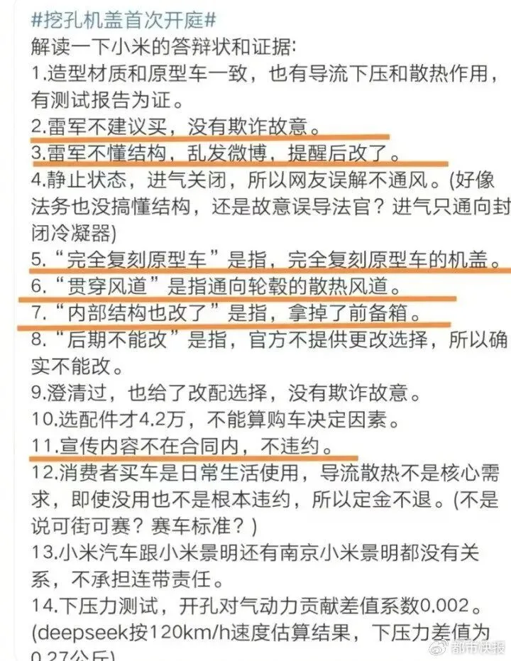 但雷军恐怕笑不出来,前几日小米SU7Ultra的“挖孔机盖”纠纷正式开庭,为了增添证据,小米法务甚至拿出了“雷军不懂结构,发的微博不算数”这样的指摘,看得全网一头雾水。