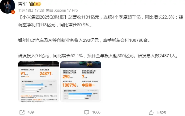 昨日,小米集团发布业绩公告,2025年第三季度实现营收约1131.21亿元,同比增长22.3%,连续4个季度突破千亿元;经调整净利润为113亿元,创历史新高,同比增长80.9%。