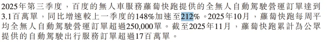 2025年Q3,萝卜快跑提供的全无人自动驾驶订单飙涨到310万单,同比增速较Q2的148%加速至212%。