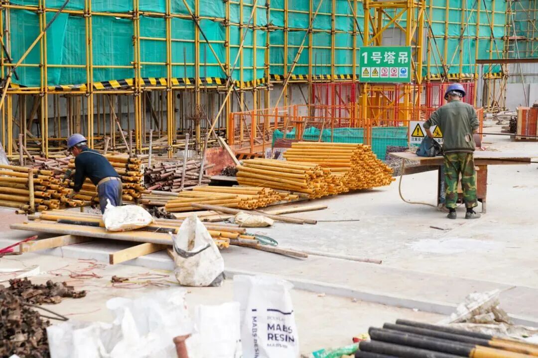 走进项目施工现场,一派繁忙景象映入眼帘,工人们正紧锣密鼓地进行施工作业。