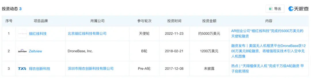 雷达财经注意到,据天眼查,大疆创新最近一次公开的投资事件,还要追溯到2022年的11月。彼时,大疆创新和蓝驰创投、联想创投、经纬创投等投资机构共同参与了罗永浩创办公司细红线科技的天使轮投资。