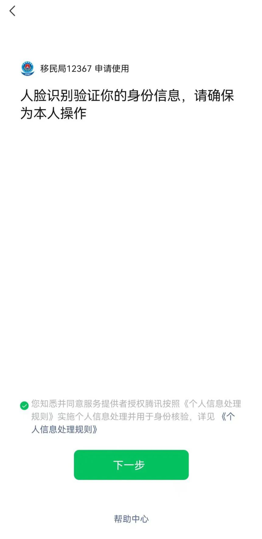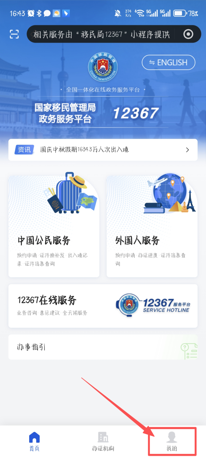 第一步:“移民局12367”微信小程序首页,点击右下角【我的】前去输入个人信息、人脸识别认证登录。