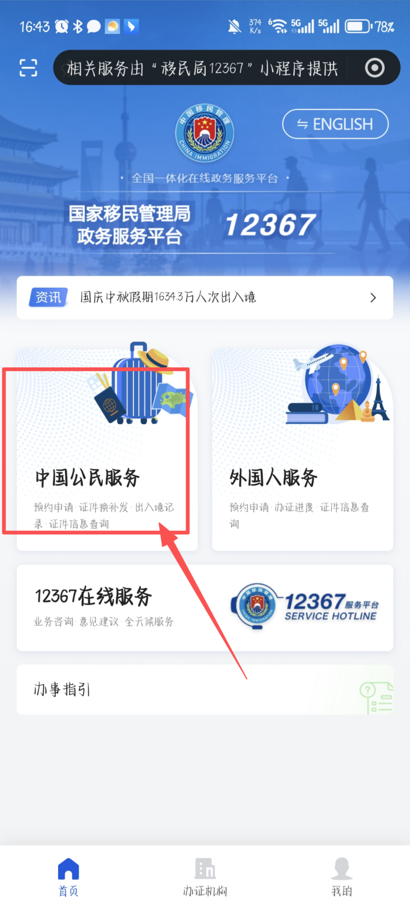 第二步:回到小程序首页,点击【中国公民服务】—【证件补换发网上申请】。