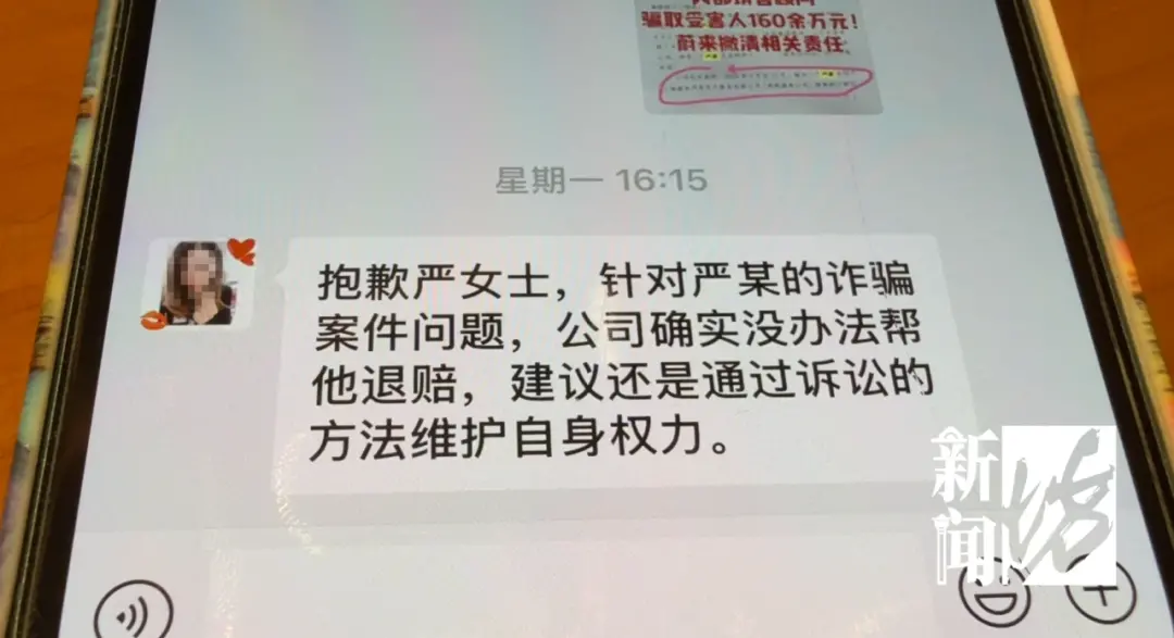 严女士说,严某实施诈骗时,就是蔚来公司正式员工。消费者一般都会认为,其行为代表公司,很难产生额外疑虑。因此她认为,蔚来汽车对于自己的员工管理,负有不可推卸的责任。