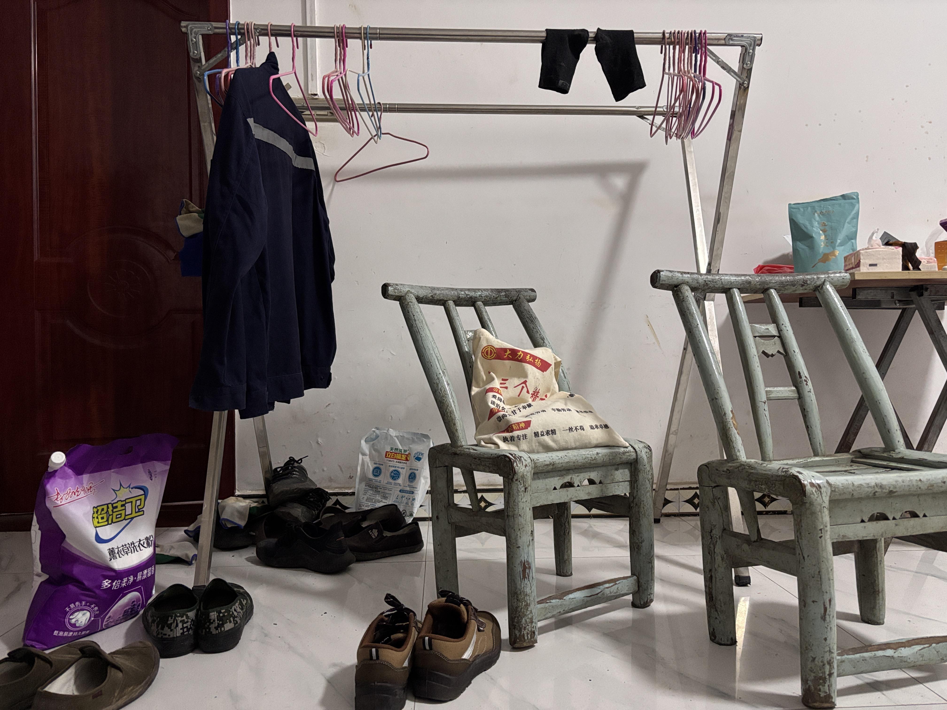李红星房间外的衣架上挂着他的工作服,地上是他的工作鞋。(黎康摄)