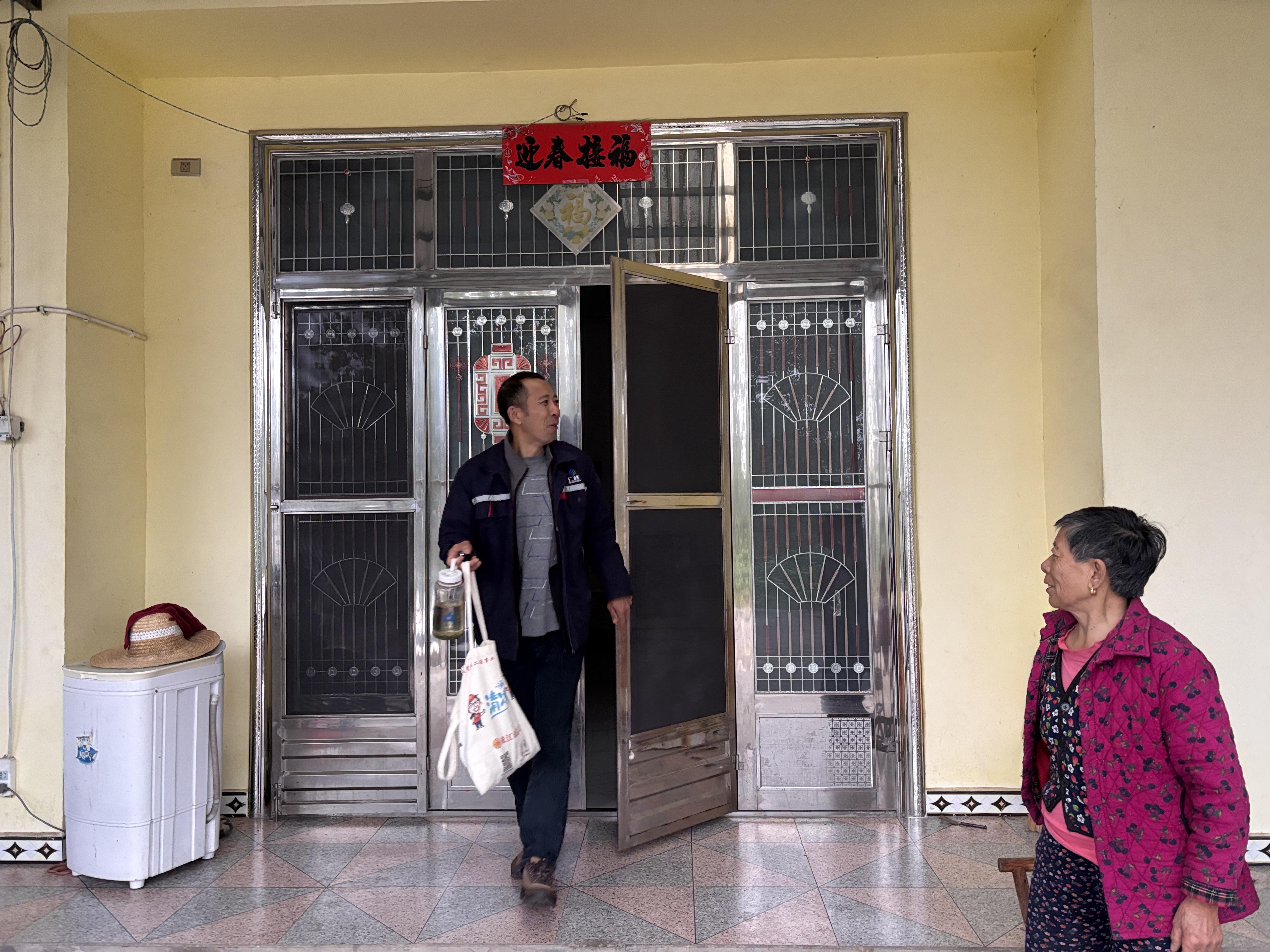 李红星收拾好东西准备上班,在家门口与母亲道别。(黎康摄)