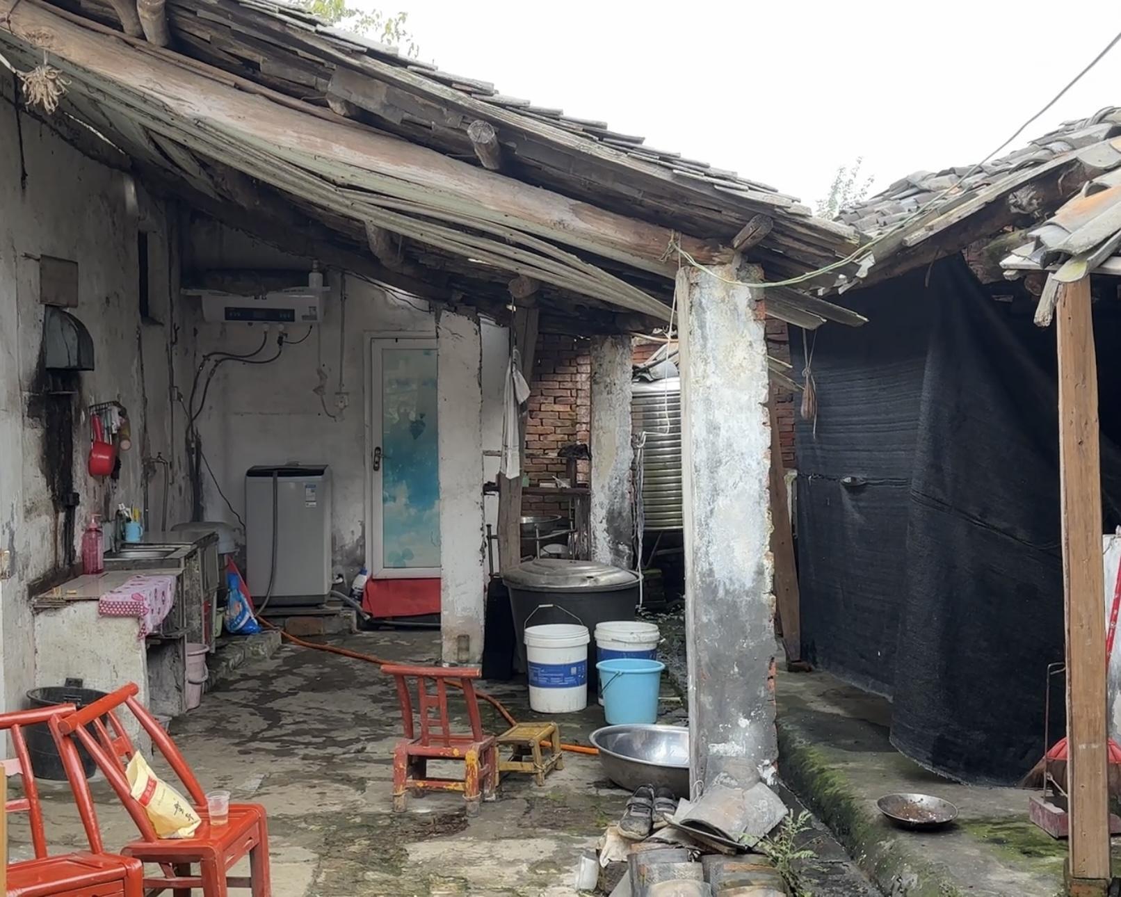 熊孝红家后院一角,瓦屋年久失修,好几根木梁已开裂。(黎康摄)