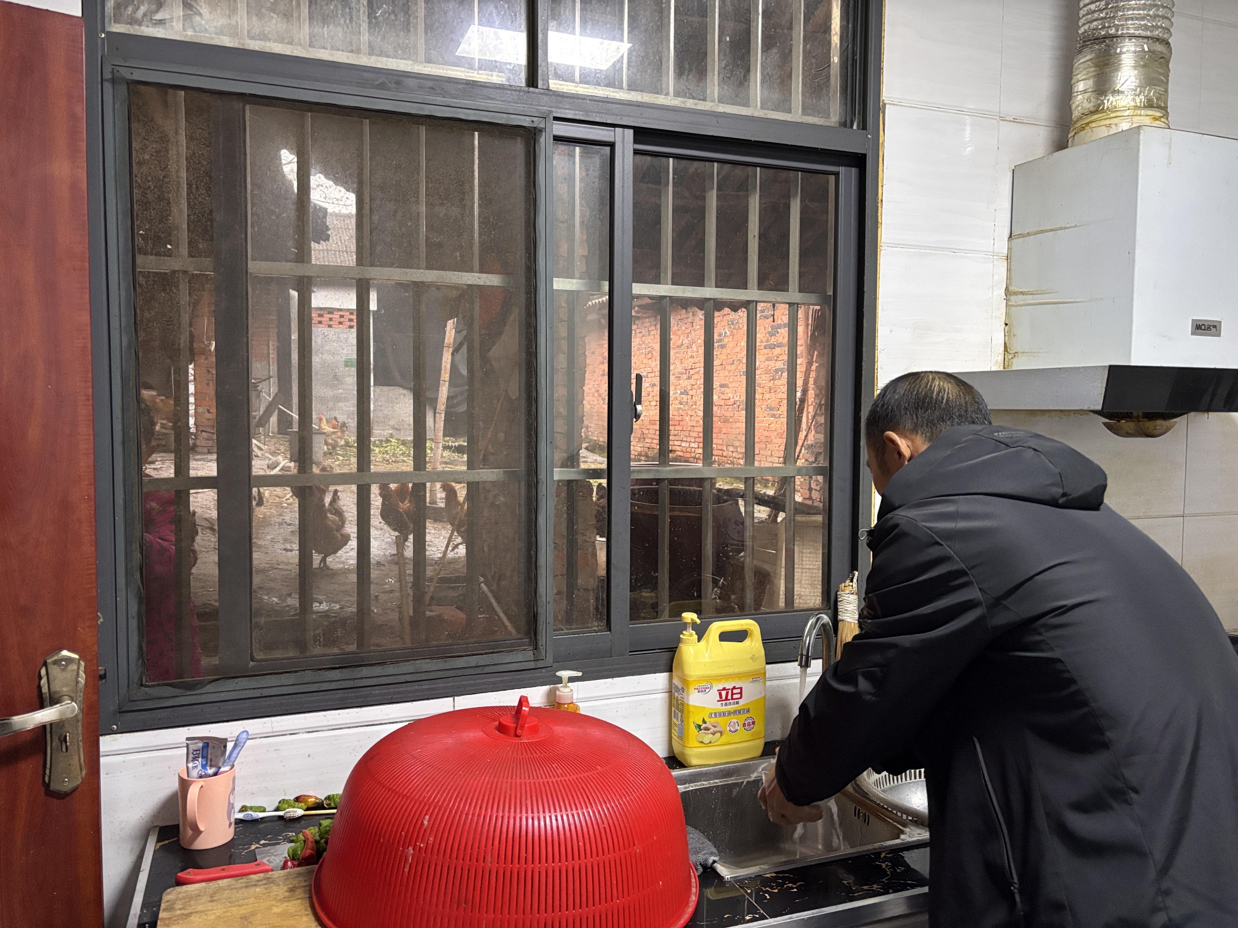 李红星吃过早餐,将碗筷洗净。厨房窗外是母亲在后院养的鸡。(黎康摄)