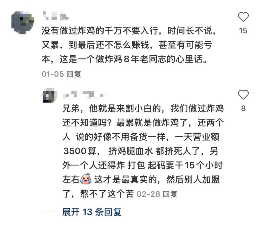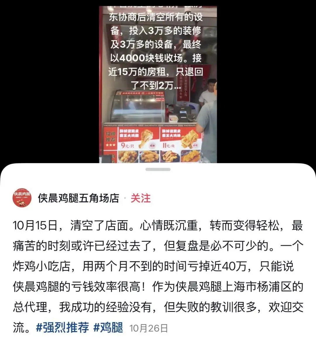 在抖音、小红书等平台,#炸鸡店倒闭#话题下堆积着数以万计的控诉,有人开了三个月钱没赚成,还负债20万的。