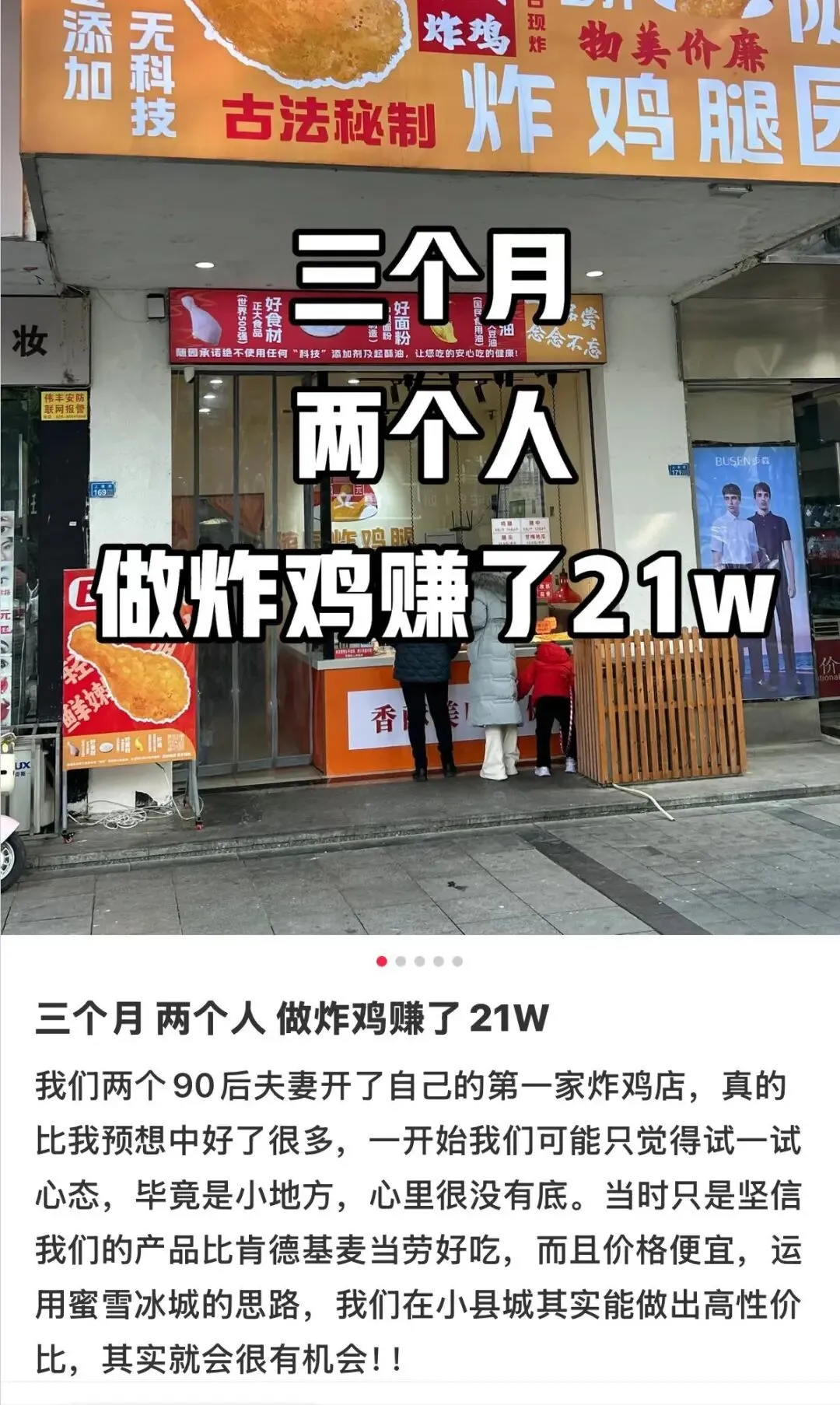 社交平台上“三个月两个人做炸鸡赚了21万”“开炸鸡小店6个月实现财富自由”“靠自己开炸鸡店三个月赚了18万”等此类造富故事层出不穷。