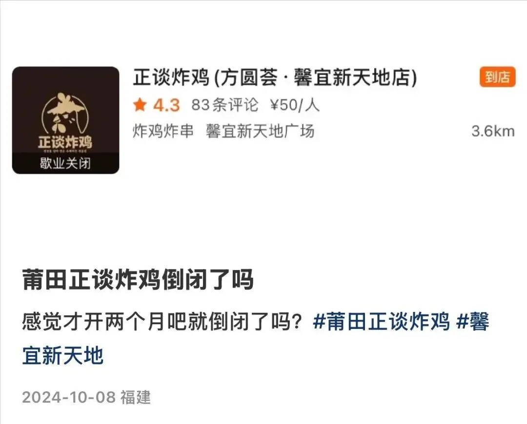 如今在社交平台上,正谈炸鸡也是被网友曝出多地关店,有的门店更是开了两个月就倒闭。