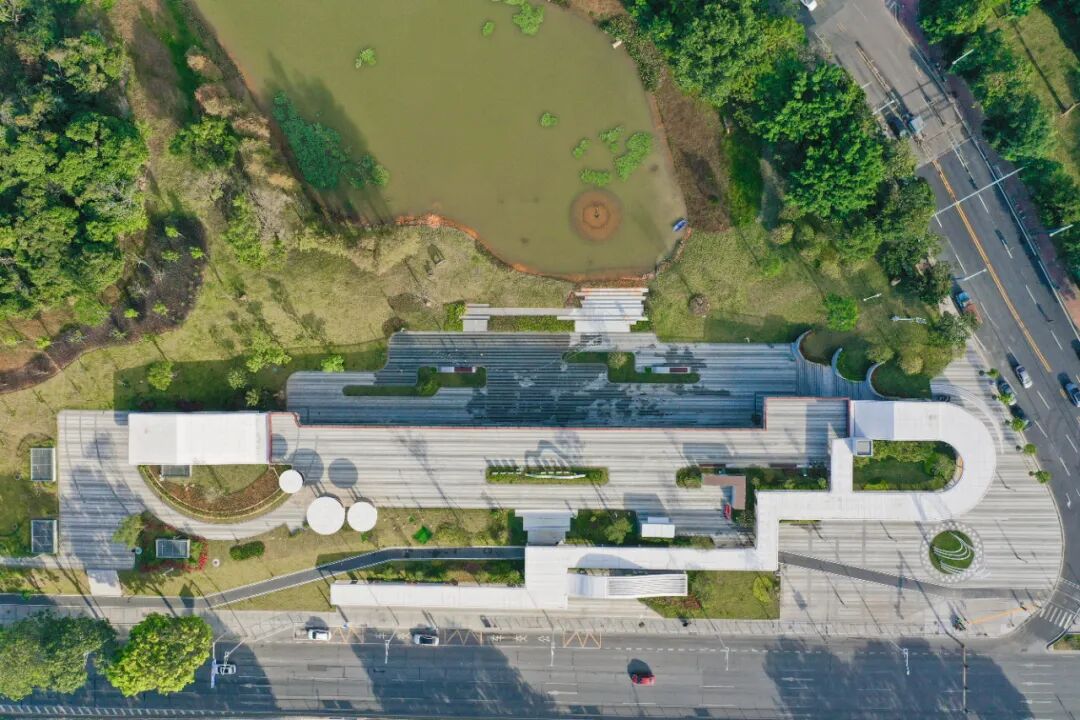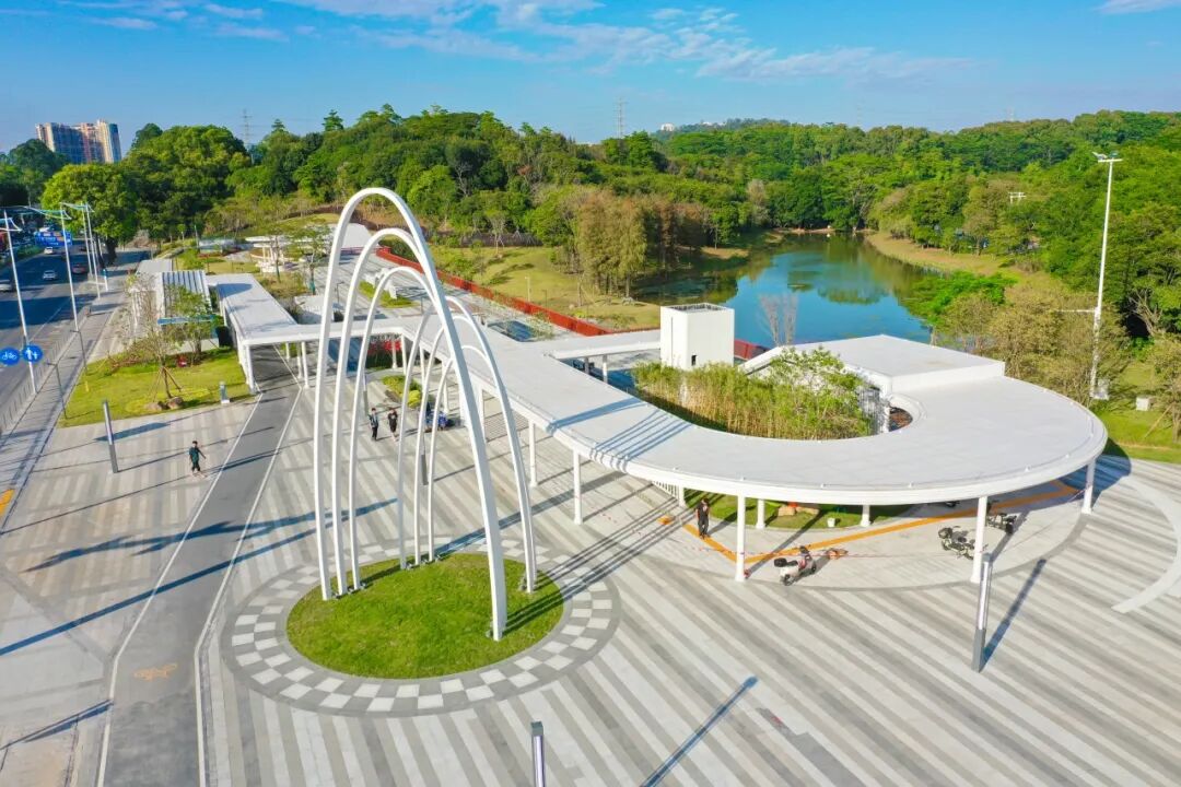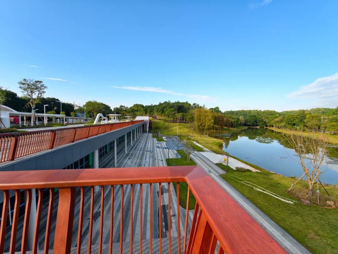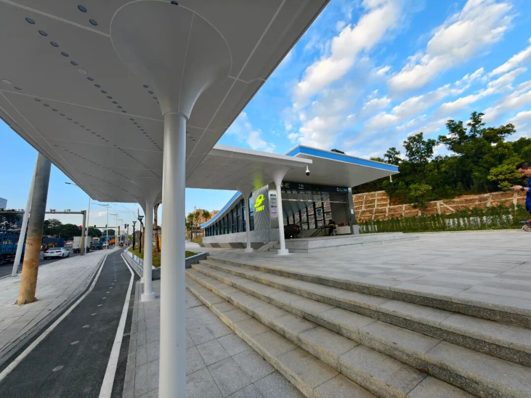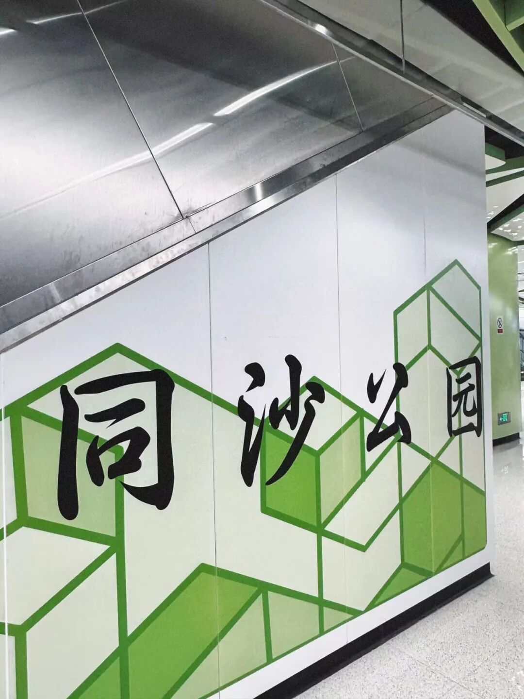 走出同沙公园站,同沙湖公园的湖光山色瞬间铺满视野——这是东莞首个“出站即见景”的地铁站点,将建筑美学与自然景观演绎到极致。站体以渐变绿色为主色调,竖条格栅勾勒出山峦轮廓,把同沙山林的意象嵌入地铁建筑;H出入口的立体站名、A1出入口的现代站亭,每一处都在诉说“建筑是自然延伸”的设计哲学。白色连廊蜿蜒衔接地铁与公园步道,圆形景观亭、艺术拱形装置点缀其间,既是遮阴休憩处,更是文旅打卡地标。