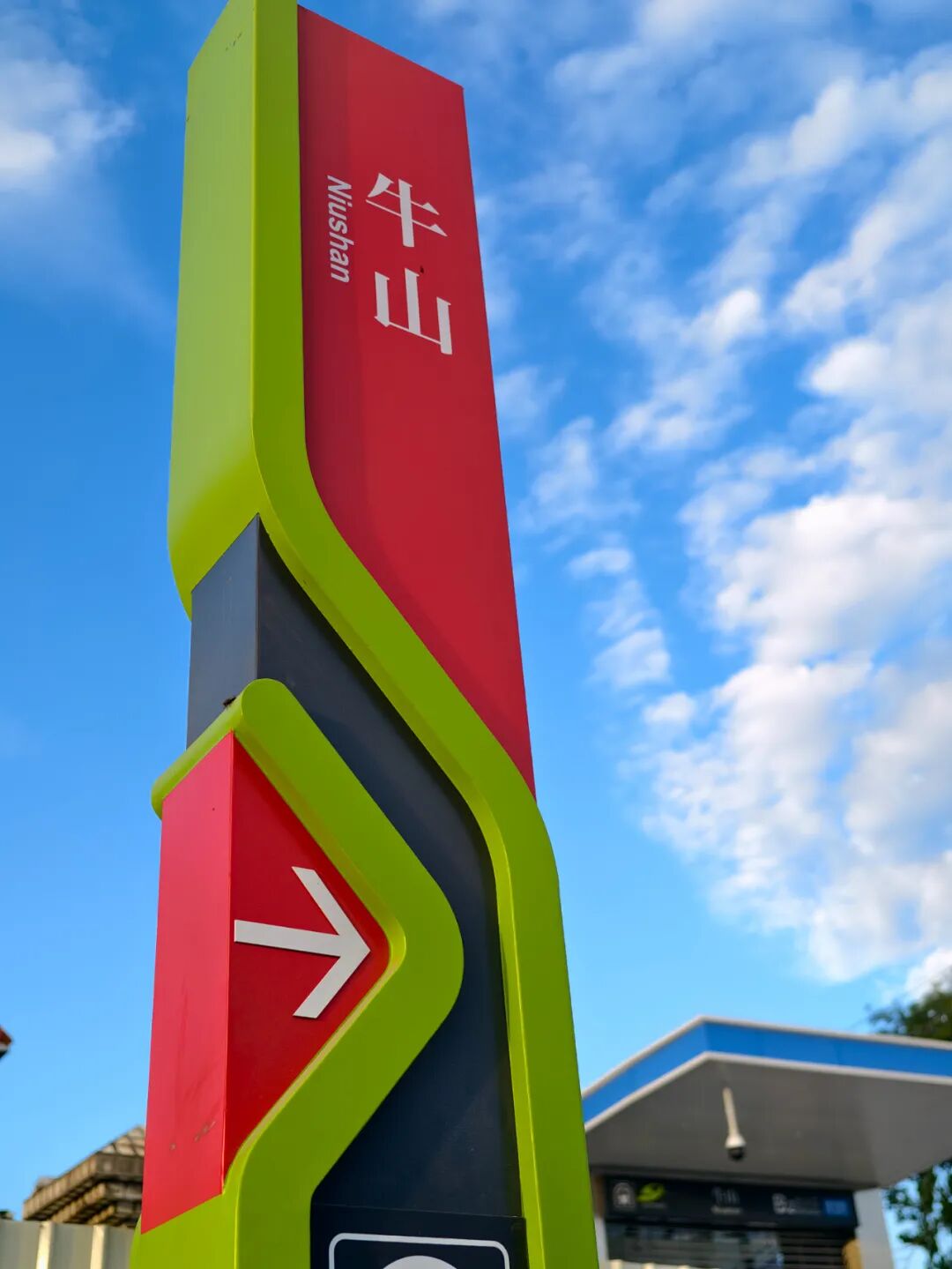 东城南站的蓝白曲线屋顶如灵动飘带,玻璃幕墙通透敞亮,现代感站体与周边高架桥、产业建筑浑然一体。白色连廊延伸出的伞状立柱兼具艺术感与实用性,镂空顶棚遮阳挡雨;中英文对照的标识系统、色彩鲜明的导向柱,让初次到访者也能“不迷路”。无障碍坡道平缓宽阔,周边绿化郁郁葱葱,规整的停车区域为自驾换乘者提供便利,每一处细节都在诠释 “美观与实用的平衡”。