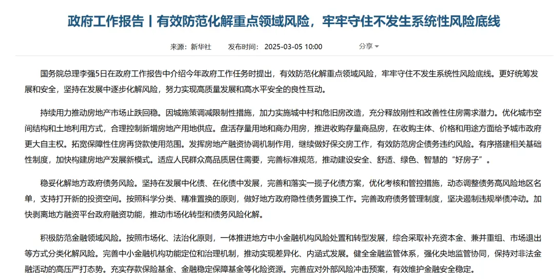 2025年的《政府工作报告》提出,要积极防范金融领域风险。按照市场化、法治化原则,一体推进地方中小金融机构风险处置和转型发展,综合采取补充资本金、兼并重组、市场退出等方式分类化解风险。