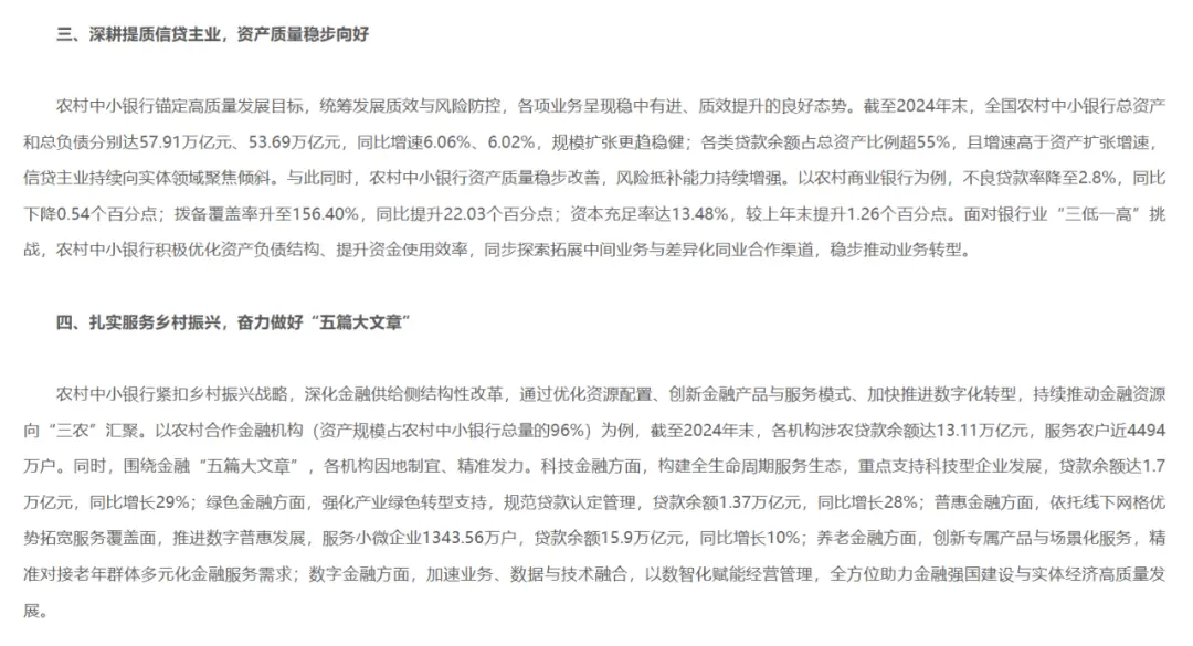 根据中国银行业协会数据,截至2024年末,全国中小银行总资产57.91万亿元,各机构涉农贷款余额13.11万亿人民币,服务农户4494万户。