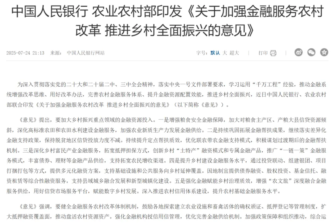2025年,中央一号文件提出,要创新乡村振兴投融资机制,各类金融机构在货币政策工具的引导下,加大涉农领域信贷投放。