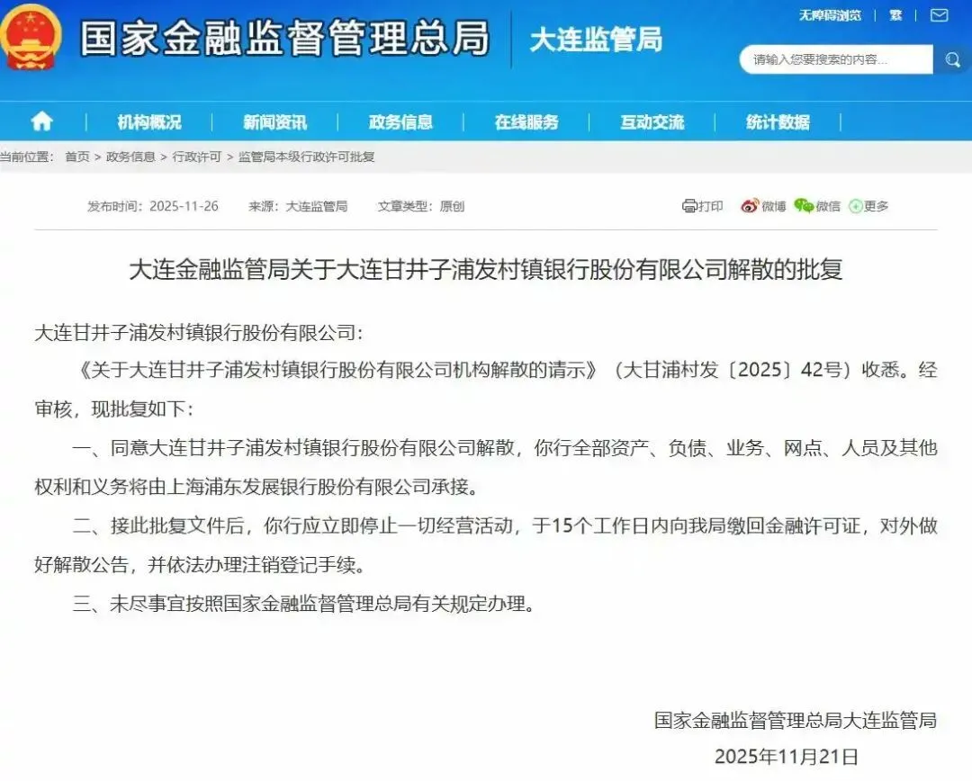11月25日,深圳坪山珠江村镇银行、鹤山珠江村镇银行解散宣布被广州农商银行合并;11月26日,大连甘井子浦发村镇银行解散。这些银行的名字已经成为历史,取而代之的是大型银行的分支机构。