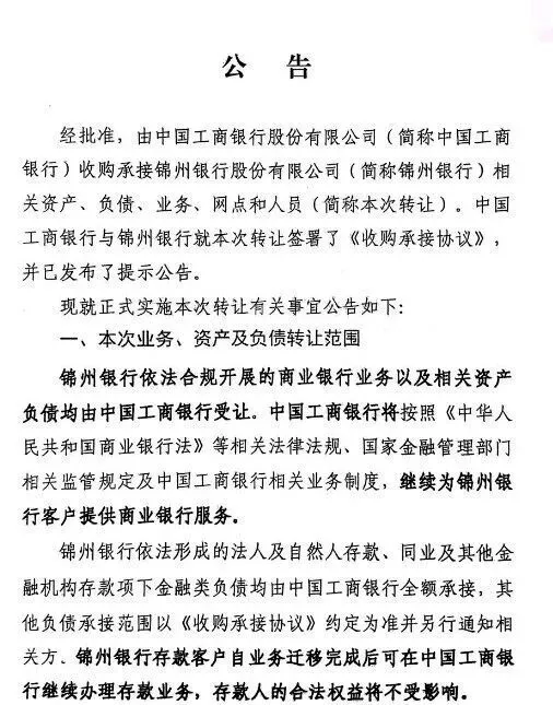 比如在10月26日,锦州银行发布提示公告:经批准,由中国工商银行收购承接其相关资产、负债、业务、网点和人员。这也是国有大行首次收购城商行的案例。