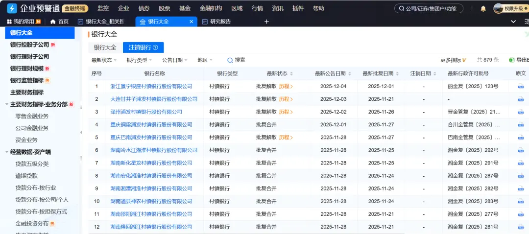 根据国家金融监管总局以及企业预警通数据,截至11月28日,已经有368家银行因监管批复合并或批复解散而注销。