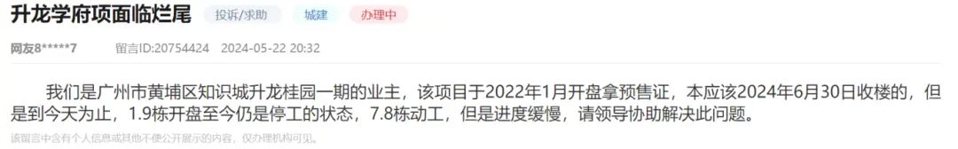 广州一直在积极解决保交房问题,去年11月,黄埔区相关部门承诺在今年9月30日前解决升龙学府上城的保交付,但是推动的过程困难重重。因为开发商拖欠原有施工方的资金,加上还有回迁安置房的建设,所以商品房的交付进程一直缓慢。